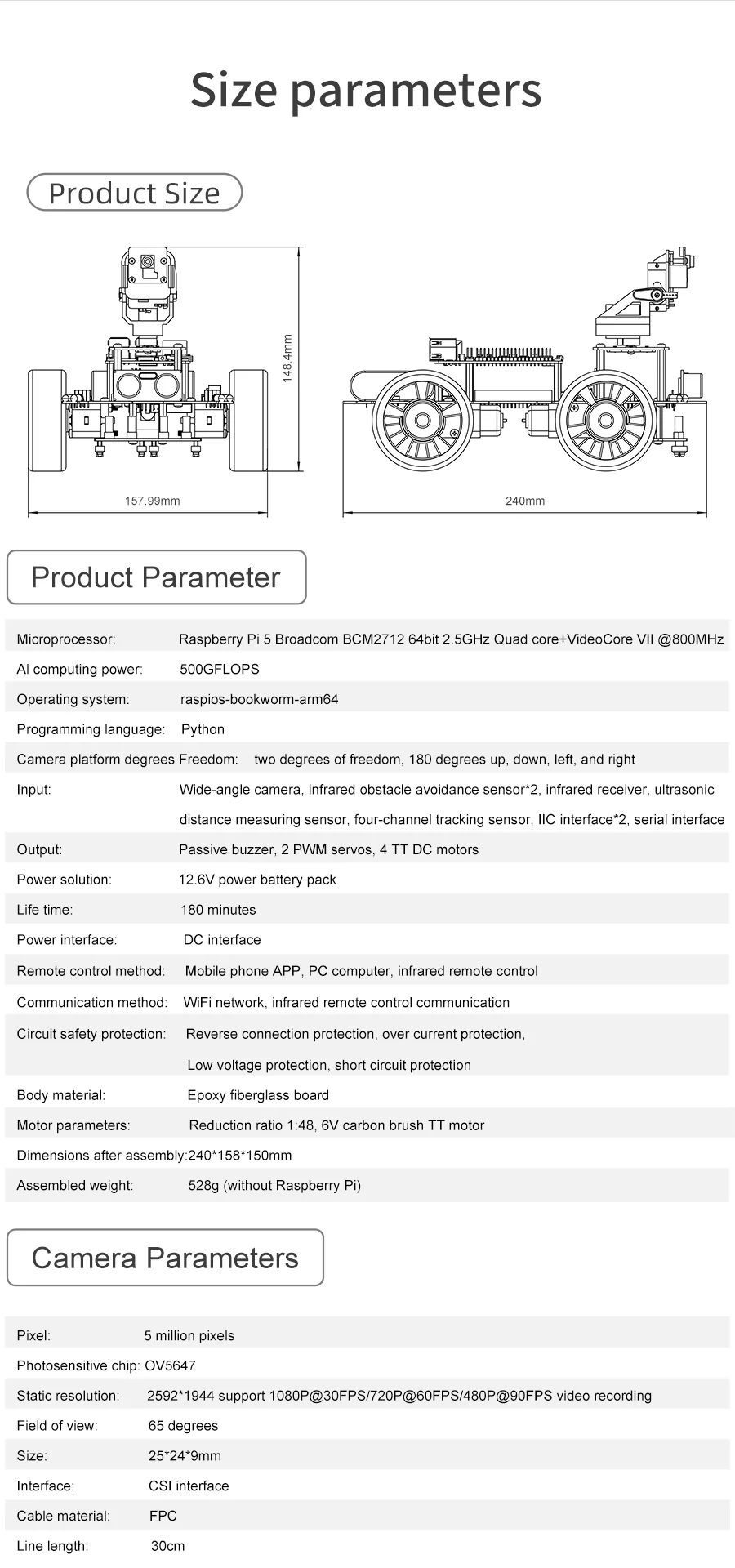 Raspbot V1 AI Vision robot car este special conceput pentru ca incepatorii sa invete AI la cel mai mic cost. Este ideal pentru placa de dezvoltare Raspberry Pi 5 4GB. Cu o placa de extensie multifunctionala pe post de sasiu, echipata cu patru motoare TT, o camera de inalta definitie, urmarire pe patru canale, modul cu ultrasunete, acest robot poate fi folosit ca masina cu telecomanda sau kit de invatare AI. La fel ca si alti roboti inteligenti de pe Smartrobot.ro, acesta poate efectua o urmarire obisnuita, evitarea obstacolelor pe baza infrarosului si a ultrasunetelor, precum si alte functii. Se pot crea o serie de functii AI pentru Raspbot pe baza CV-ului Open Source de programare Python3. Utilizatorii pot controla aceast robot prin APP, IR, web Jupter Lab si se pot bucura de experienta vizuala FPV.
